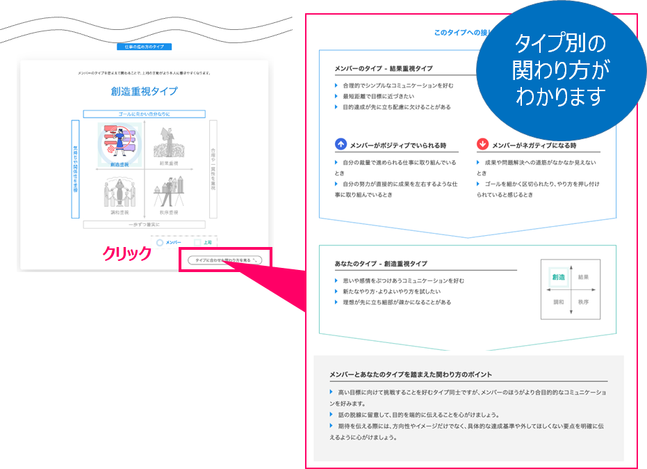 10/1以降、上司ユーザーが初めてログインした際に、 タイプ判定のためのアンケート項目が表示されます。レポートには、上司のタイプを踏まえた関わり方が表示されます。